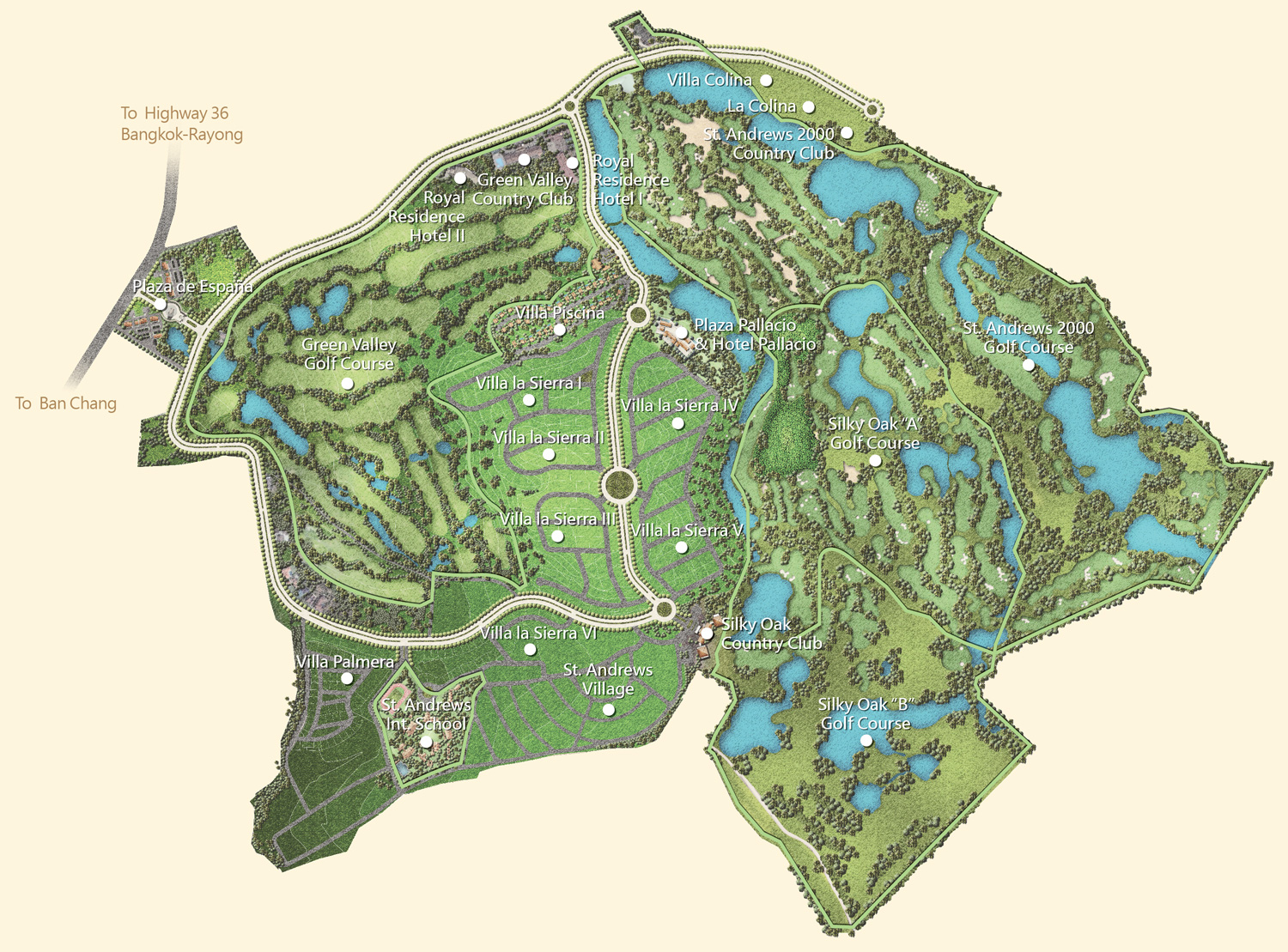 Upon a hilly and rolling vast land between Rayong and Chonburi, series of projects are created. The terrain of the land is absolutely unique, surrounded with low mountain range and high hills in the centre as the hub. Together with a town square called Plaza Pallacio, collections of contemporary Mediterranean-style villas and low-rise condominiums are woven into the rolling terrain at various heights. Having four golf courses in the vicinity with substantial real estate scheme, education facilities, hotels, clubhouses and other essential factors, the promise of the future is self strengthened. |